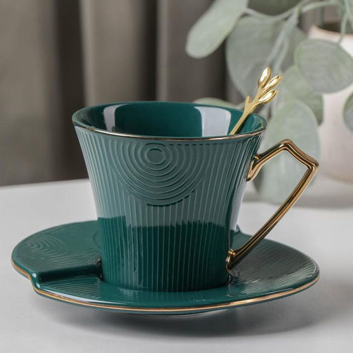 Чайная пара с ложкой в зелёном цвете — это сочетание строгой геометрии и элегантной отделки. В набор входят чашка объёмом 240 мл, блюдце диаметром 13.5 см и ложка. Рельефный узор и золотая окантовка добавляют изделию выразительности, не нарушая общей гармонии. Такой комплект станет стильным акцентом вашего утреннего или вечернего чаепития.Стиль, который чувствуетсяЗелёный оттенок с геометрическим рисунком задаёт современный тон без излишней декоративности.Рельефная текстура делает каждую деталь тактильно интересной.Золотые акценты добавляют нотку праздника даже в повседневное чаепитие.В комплекте есть ложка — всё необходимое собрано в одном наборе.Форма чашки и блюдца продумана для удобного и аккуратного использования.Когда чай становится ритуаломЭтот набор создан для тех, кто ценит красоту в мелочах и выбирает посуду с характером. Зелёная чайная пара с золотыми вставками подходит как для утреннего кофе, так и для вечернего чая с друзьями. Она подчеркнёт ваш вкус и подарит ощущение уюта в каждом глотке. Количество персон: 1. Объём, мл: 240. Тематика: Геометрия. Рисунок: Да. Наличие подставки: Нет. Можно мыть в посудомоечной машине: Нет. Можно использовать в СВЧ-печи: Нет. Текстура: С рельефом. Особенности: С золотой отводкой. Матовая поверхность: Нет. Бесплатная доставка: Да. Размеры товара: 13.5/8/13.5. Примечание: Оттенок данного товара может незначительно отличаться от фото/видеоизображения (в зависимости от настроек яркости вашего экрана)..