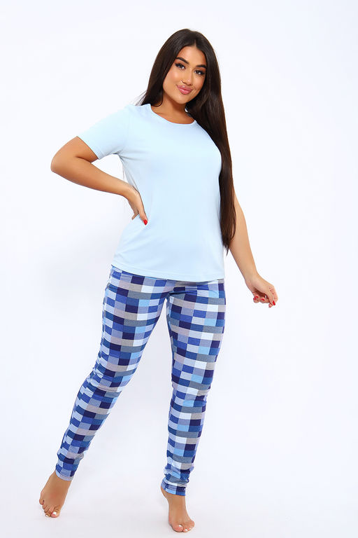 Костюм женский домашний с брюками в пижамном стиле выполнен из хлопка 100%. Футболка с коротким рукавом, брюки в клетку на резинке. Костюм идеально подойдет для дома и сна.