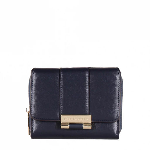 Компактный кошелек складывается пополам, выполнен из экокожи. Дополнен золотистой фурнитурой. Закрывается на клапан.