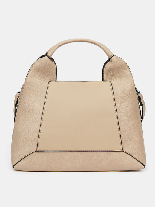 Сумка тоут женская оригинальной формы из экокожи. Закрывается на молнию, внутри есть карман для документов и карт. Трапециевидные детали и угловые вытачки делают силуэт сумки необычным. Молнии по бокам меняют вместительность модели. Две короткие ручки для ношения в руках, длинный съемный ремешок на плече или как кроссбоди. Сумка бежевая тоут дополнит повседневные деловые и женственные образы.