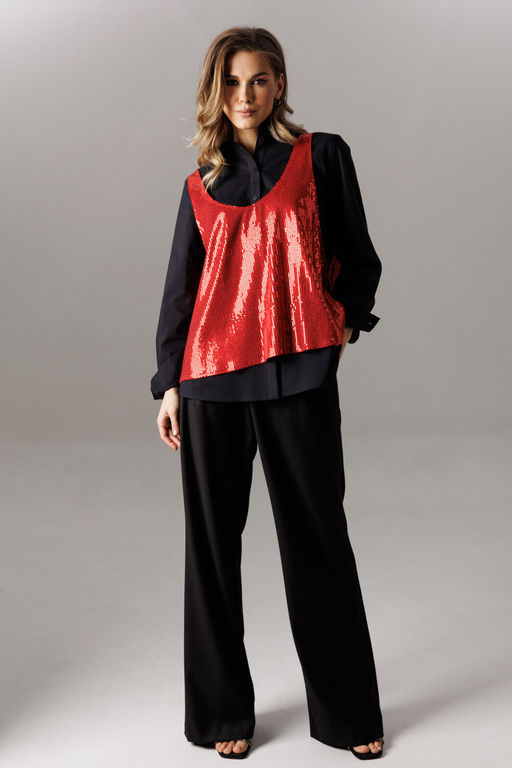 Майка выполнена из трикотажного полотна с пайетками свободного прямого силуэта в стиле оверсайз. Спереди и сзади имеет глубокие овальные вырезы и удлиненную линию проймы. Майка съемная. Длина изделия от плечевого шва по спинке 62 см.