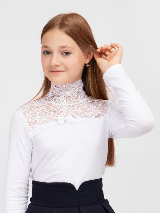 Школьная блузка с длинным рукавом и воротником-стойкой. Верхняя часть и воротник выполнены из нежного кружева. Мягкий, приятный к телу трикотаж обеспечит идеальную посадку изделия по фигуре. Модель прекрасно подчеркнет индивидуальный стиль девочки, и разнообразит ее повседневный школьный образ.