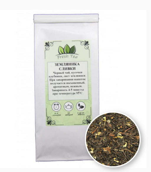 Черный чай, кусочки клубники, лист земляники. При заваривании напиток получается насыщенный, ароматным, нежным. Заваривать 4-5 минуты при температуре 95C.