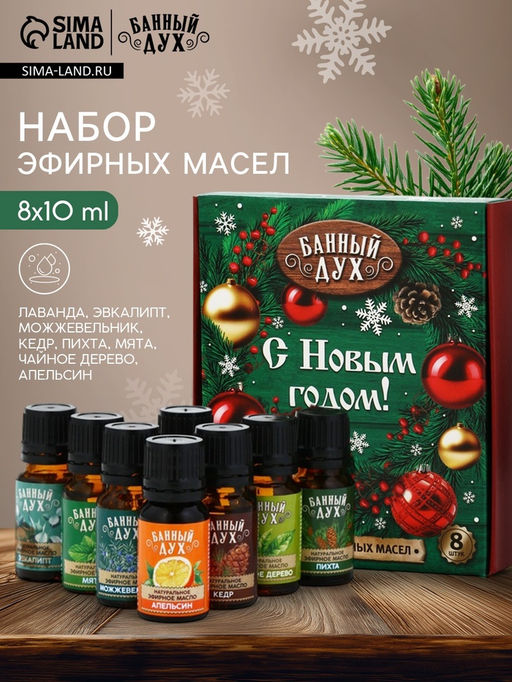 Набор: Да. Для кого: Для мужчины. Для кого: Для женщины. В наборе, шт.: 8. Объём, мл: 80. Вид упаковки: Подарочная коробка. Символ года: Нет. Тематика праздника: Новый год. Адресат: Без адресата. Возраст: Взрослый. Аромат: Апельсин. Аромат: Кедр. Аромат: Мята. Аромат: Пихта. Аромат: Чайное дерево. Аромат: Можжевельник. Аромат: Лаванда. Аромат: Эвкалипт. Составляющие набора: Эфирное масло. Возраст: Для взрослых. Бесплатная доставка: Да.