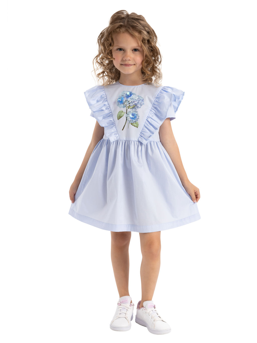 Платье из тонкого хлопка, отрезное по линии талии. На лифе симметричные рельефы, в которые вставлены оборки, на лифе принт с декоративными элементами, юбка со сборкой, на спинке застежка в виде длинной молнии.