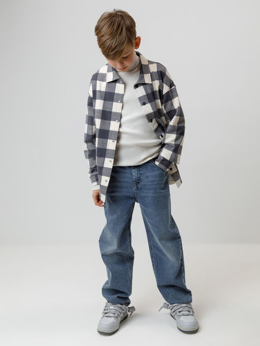Свободная трикотажная рубашка для мальчика из мягкого петельчатого футера. Застёгивается на кнопки. Модель с закругленным низом и спущенным плечом. Рисунок в клетку выполнен из стойких текстильных гипоаллергенных красителей. Изделие сохраняет цвет и форму после многократных стирок. Все трикотажные полотна производятся в соответствии с нормами швейцарского сертификата ЭкоТекс.. Состав: 100% хлопок