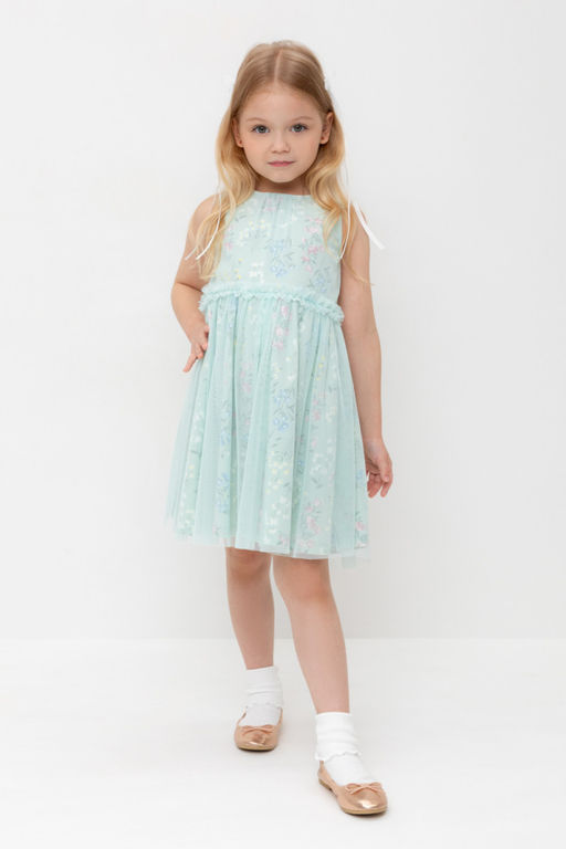 Легкое нарядное платье для девочки из высококачественного трикотажа, верхний слой - из сетки. Застёгивается на спинке с помощью кнопок. Оригинальная набивка выполнена из стойких текстильных гипоаллергенных красителей. Изделие сохраняет цвет и форму после многократных стирок.­