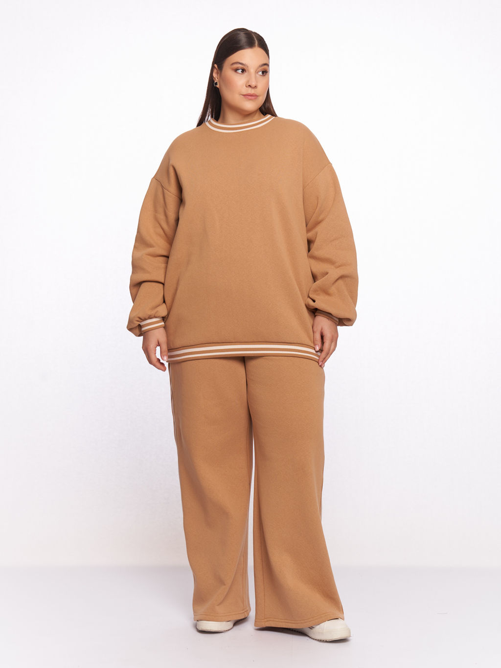 Теплый спортивный костюм большого размера с начесом Женский теплый брючный костюм большого размера бежевого цвета идеальный выбор для комфортного и стильного образа в прохладное время года. Выполнен из мягкого футера с начесом. Спортивный костюм состоит из прямого свободного свитшота оверсайз и широких брюк в стиле палаццо на резинке и с высокой посадкой. Свитшот с круглой горловиной и спущенными плечами. Длинные широкие рукава украшены манжетами из кашкорсе. Также трикотажная отделка расположена по низу и горловине. Брюки украшены декоративными лампасами и дополнены карманами в боковых швах всё для удобства и комфорта. Карамельный оттенок и трендовый крой делают костюм универсальным вариантом для полных девушек, доступным в широком размерном ряду. Размер на модели: 60-62 Параметры модели: рост 175, 110/98/130 -- Характеристики -- Сезон: Демисезон Материал: Футер с начесом Состав?01) 100% хлопок 02) 95% хлопок, 5% эластан 03) 60% вискоза, 40% хлопок 04) 60% вискоза, 40% хлопок 05) 75% хлопок, 25% полиэстер 06) 50% вискоза, 35% полиэстер, 10% шерсть, 5% эластан 07) 65% полиэстер, 25% вискоза, 10% эластан: 95% хлопок, 5% эластан Цвет: бежевый Принт: однотонный Стиль: Для полных, Повседневный, Спортивный Силуэт: Прямой Особенности: большие размеры, для полных, оверсайз Карманы: В шве Длина рукава: Длинные Вырез горловины: круглый Застежка: Без застежки Тип рукава: Спущенный Стирка: Деликатный режим, не более 40 градусов Страна производства: Россия