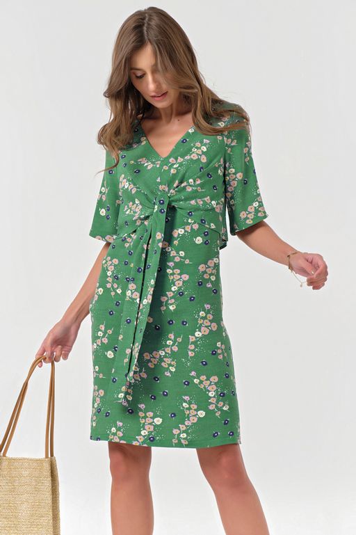 Особенности: Платье полуприлегающего силуэта. Детали: отлетная кокетка по переду и спинке, концы кокетки переда переходят в завязки, широкий рукав. Без застежки.