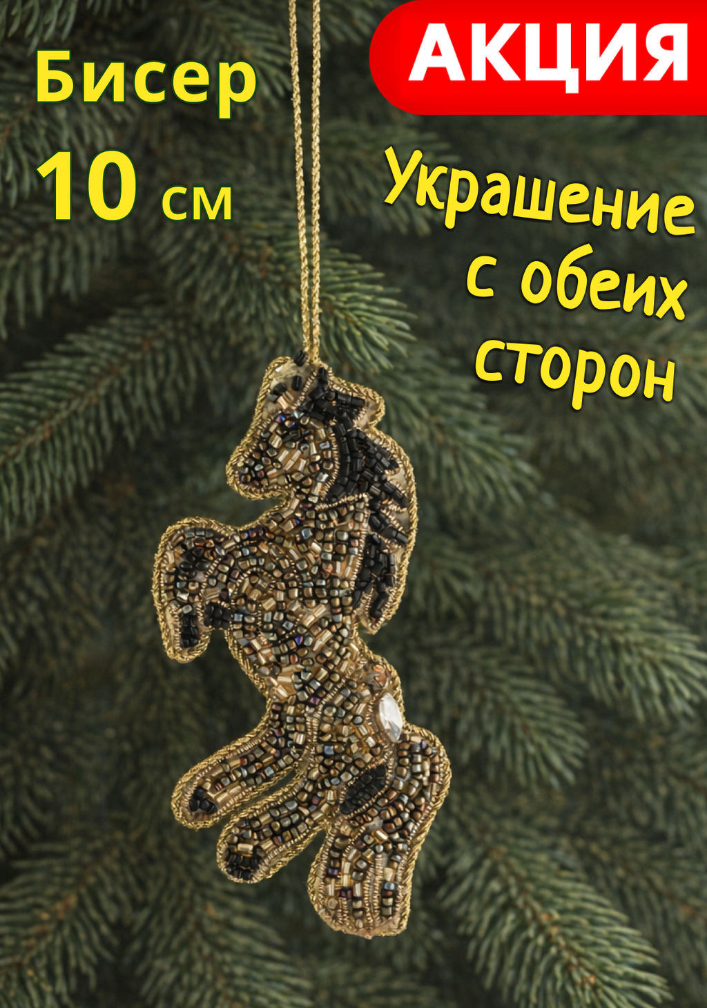 • Игрушка елочная, 10 см, бисер/полифилл, черно-золотистая, Конь, New year