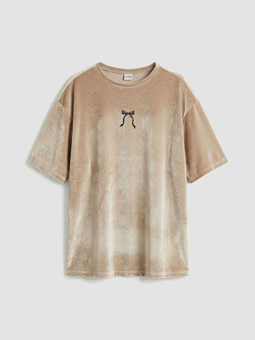 • Bisiklet Yaka Fiyonk Bask?l? K?z ?ocuk Kadife Ti??rt