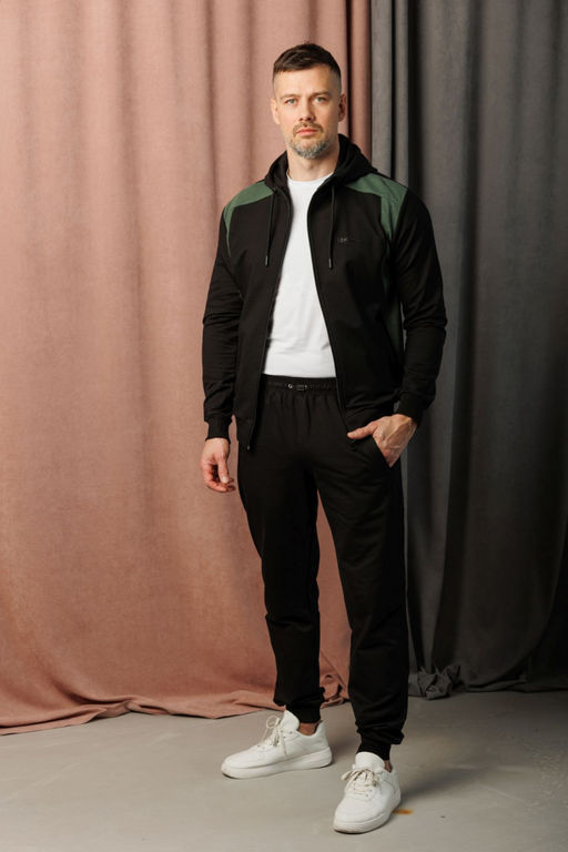 Верх - толстовка на молнии с капюшоном отличается интересным сочетанием фактур: основная часть изделия выполнена из гладкого полотна, а боковые вставки и участки на плечах — из ткани с более выраженной рельефной структурой. Это визуально подчёркивает линии корпуса и придаёт костюму выразительность. Боковые карманы на молнии. Рукава и низ изделия оформлены манжетами, обеспечивающими комфортную посадку.