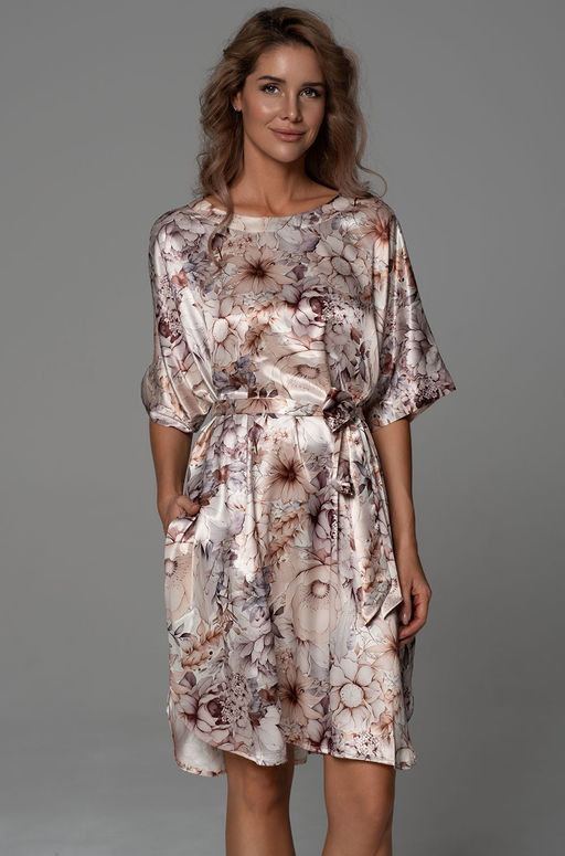 Туника Mia-Amore свободного кроя длиной до колен с цельнокроеными укороченными рукавами выполнена из принтованного смесового шелка. Округлый вырез горловины и низ рукавом обработаны обтачками из принтованного атласа. Туника комплектуется поясом, в боковых швах обработаны карманы. Состав:70% натуральный шелк, 25% полиэстер, 5% эластан