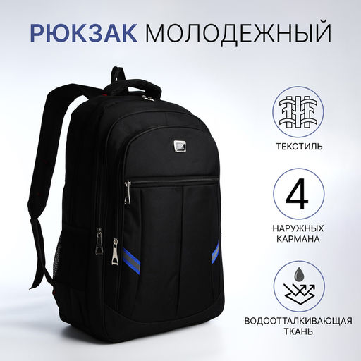 • Рюкзак молодёжный на молниях, со светоотражающими элементами, 2 отдела на молнии, 4 кармана, размер 37×17×54 см, чёрный/синий