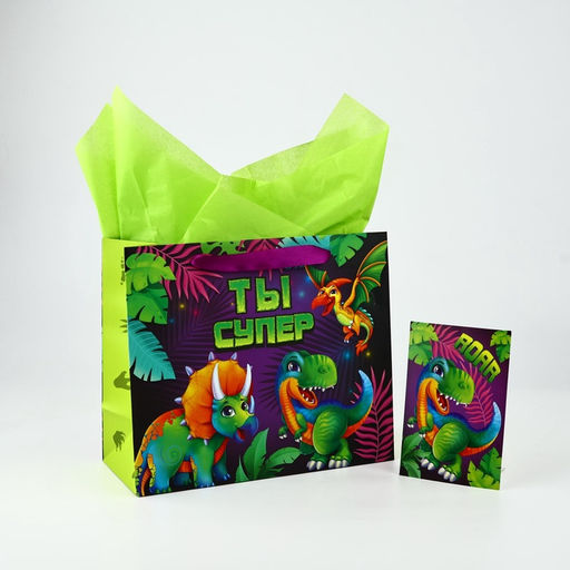 • Пакет ламинированный двухсторонний «Динозаврики», с тишью и открыткой, ML, 23×27×11.5