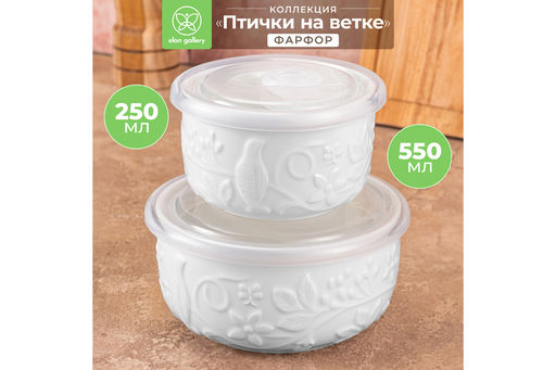 Набор Elan Gallery из серии "Птички на ветке" состоит из 2 салатников с пластиковыми крышками разного объема: 250 мл и 550 мл. Контейнеры подойдут для сервировки, транспортировки и помогут компактно хранить продукты. В комплект входят контейнеры: размером 10,5х10,5х6 см (размер без крышки 9,5х9,5х5,5 см), размером 13х13х6,5 см (размер без крышки 12,5х12,5х6,5 см). Чаши выполнены из белого фарфора и украшены рельефными узорами. Крышечки на глубоких блюдах выполнены из пищевого пластика полипропилена и имеют силиконовые уплотнители. Пищевой пластик не выделяет вредных веществ и безопасен для здоровья. Фарфоровые миски имеют на крышечках клапаны для контроля воздуха внутри. Универсальный инвентарь подходит для хранения в холодильнике и транспортировки готовых блюд. Благодаря изящному дизайну подходит для подачи салатов на стол. За счёт глубокой формы миски удобны для смешивания ингредиентов. Ёмкости можно использовать для различной еды на даче и пикнике. Не рекомендуется применять абразивные моющие средства. С открытым клапаном на крышке можно использовать в микроволновой печи. Можно мыть в посудомоечной машине. Набор поставляется в стильной картонной упаковке. Салатники из серии посуды "Птички на ветке" станут украшением вашей кухни или приятным подарком на любой праздник. Благодаря стильной коробочке не понадобится подарочная упаковка. В коллекции бренда Элан Галерея можно найти сервировочные блюда, тарелки и кухонные ёмкости для хранения на любой вкус. Ознакомьтесь со всем ассортиментом товаров для дома.