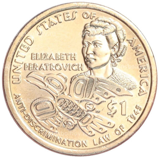 Монета 1 доллар 2020 года D США Коренные американцы (Сакагавея) Элизабет Ператрович и Закон о борьбе с дискриминацией 1945 года