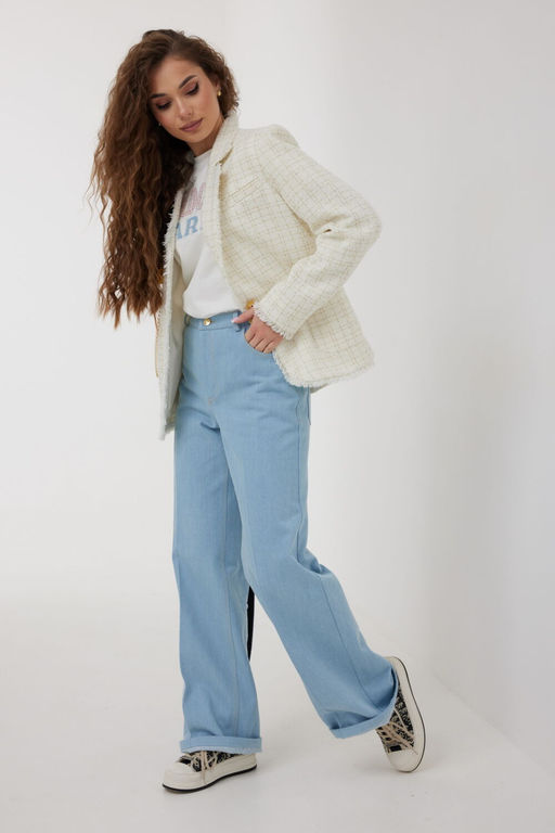 Брюки женские из джинсовой ткани, прямого кроя,  расширенные книзу, высокая посадка, пояс притачной, застежка спереди на молнию и джинсовую пуговицу, по переду с боковыми карманами и заутюженными стрелками. По задним половинкам кокетки и накладные карманы, справа карман с декоративной вышивкой в тон отделочным строчкам.