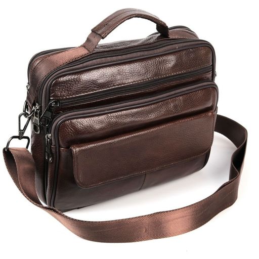 Мужская сумка из натуральной кожи коричневого цвета. Снаружи, на лицевой стенке три кармана. Сумка имеет два отделения на молниях, внутри боковой карман на молнии и открытый карман. Снаружи, на задней стенке карман на молнии. В комплекте съемный, текстильный, регулируемый по длине наплечный ремень.