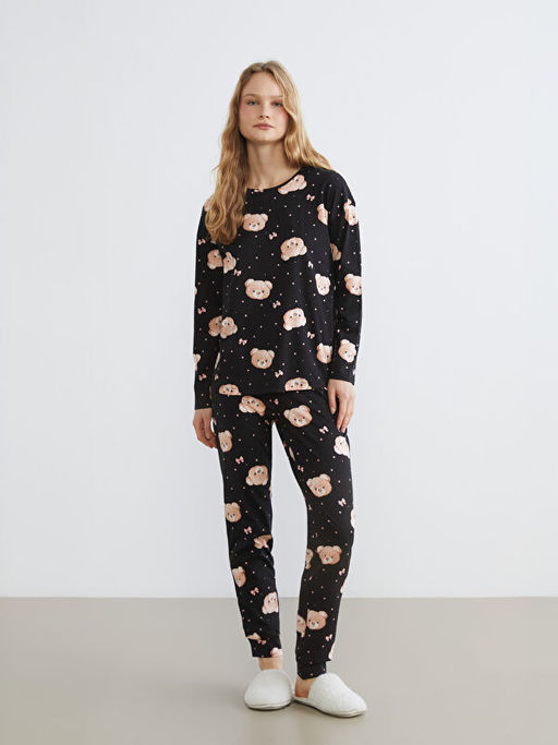 Bisiklet Yaka Ay? Bask?l? Kad?n Pijama Tak?m?