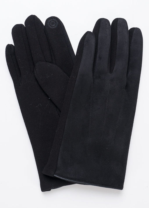 Мужские перчатки выполнены из двух полотен: верхнее - искусственная замша, нижнее, на ладони, из трикотажного полотна, которое внутри имитирует искусственный мех. Перчатка декорирована отстрочкой, на большом и указательном пальцах вышивка сенсорными нитками, размер 20. 60% пэ, 35% хлопок, 5% эластан