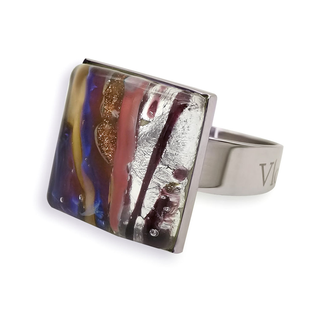 Кольцо изготовлено из муранского стекла и гипоаллергенной ювелирной стали, что очень важно для людей с чувствительной кожей. Металл не темнеет и не подвергается воздействиям окружающей среды, надолго обеспечивая красивый внешний вид изделия. Размер стеклянного элемента - 1,6*1,6 см. Кольцо безразмерное, регулируется с 16 до 19 размера. Вес - 5 гр.