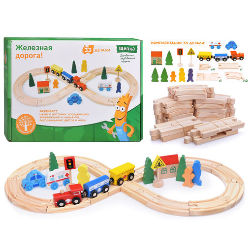 В комплекте 33 элемента: 18 участков дороги, 3 дерева, 3 фигурки, 2 знака, дом с крышей, скорая, полиция, поезд из 3-х частей на магнитном соединении вагонов.