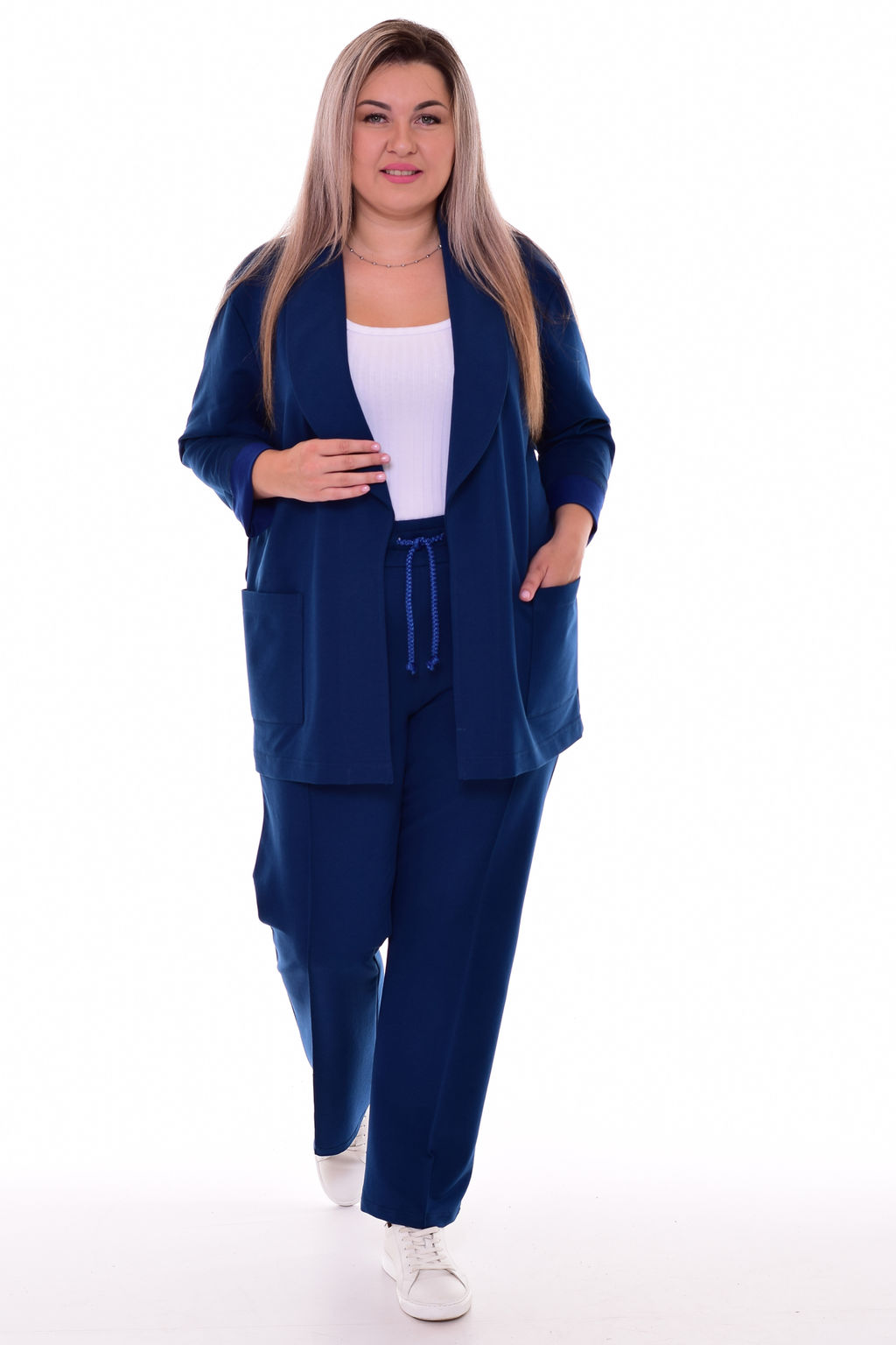 Современный костюм состоящий из жакета и брюк. Жакет без подкладки, прямого свободного кроя, с длинным рукавом, двумя накладными карманами, отложной воротник по типу шалька. Брюки свободные, широкие с отстроченной стрелкой спереди, двумя боковыми карманами, пояс на резинке со шнуром.