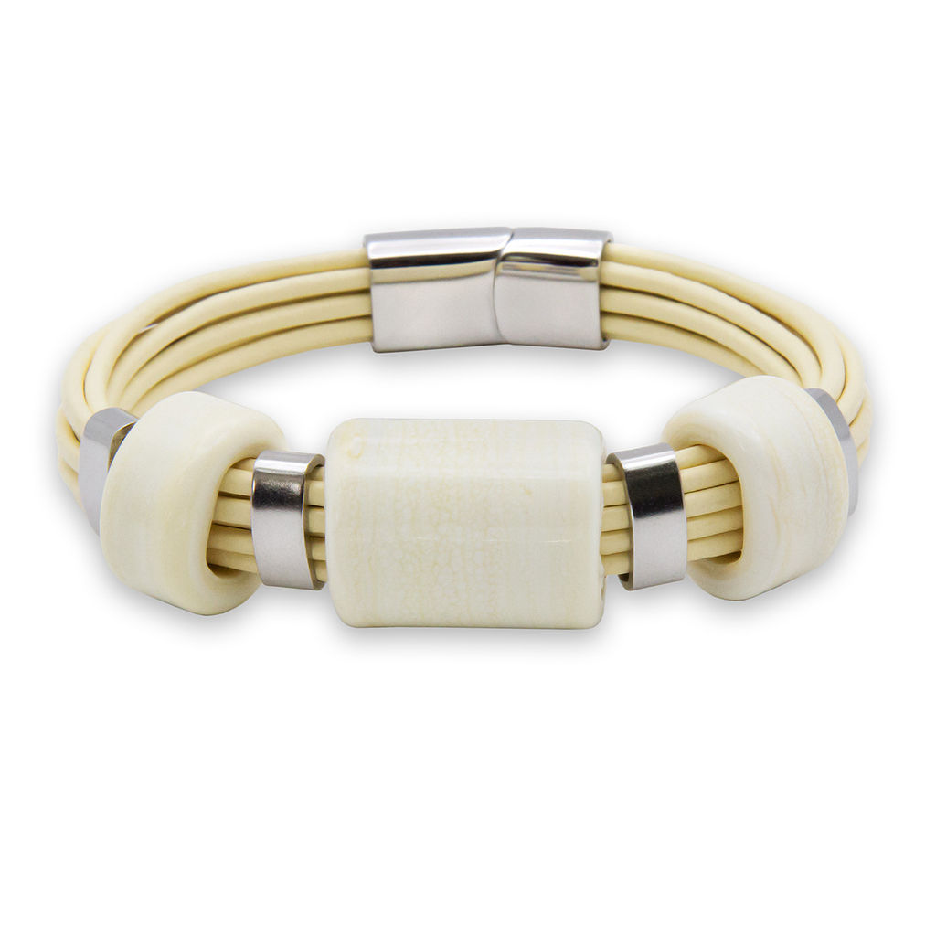 Браслет изготовлен из муранского стекла, натуральной кожи и гипоаллергенной ювелирной стали, что очень важно для людей с чувствительной кожей. Металл не темнеет и не подвергается воздействиям окружающей среды, надолго обеспечивая красивый внешний вид изделия. Крепкий магнитный замок с двойной защитой надежно фиксируется на запястье. Ширина браслета - 1,5 см. Размер стеклянных бусин - 1,9x2,5 и 1,9x1 см. Вес - 35 гр.