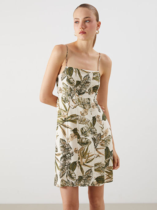 • Kare Yaka ?i?ekli Keten Kar???ml? Mini Elbise