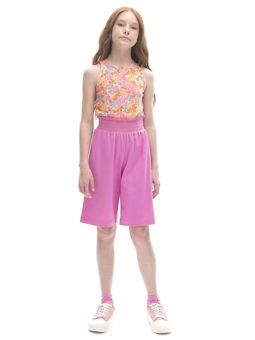Шорты-бермуды из 100% хлопка для девочки. Натуральный состав ткани и свободный крой обеспечивают комфорт вашему ребёнку. Изделие приятное на ощупь и отлично подходит для жаркой погоды. Пояс модели украшает горизонтальная сборка контрастными нитками с деликатным рюшем вверху актуальный летний тренд. Такие шорты будут носиться долго. Ребёнок растёт, и они словно "растут" вместе с ним. Однотонные яркие бермуды легко сочетать с топами и футболками различных силуэтов и расцветок.