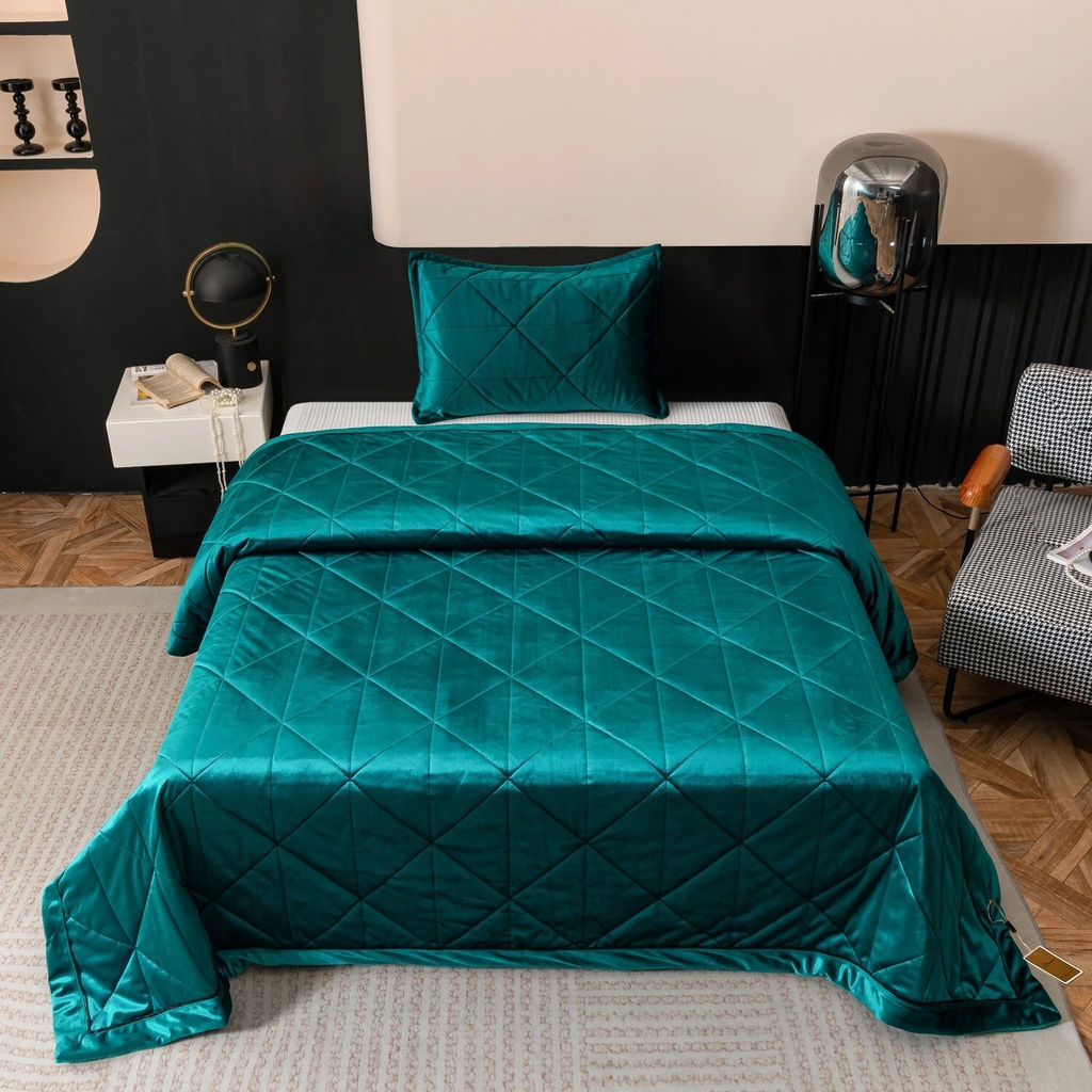 Велюровое покрывало - прекрасное дополнение интерьера спальни или гостиной, которое внесёт в пространство особую энергетику домашнего уюта. Отличительной чертой покрывала является невероятно мягкая бархатистая поверхность, которая подарит Вам незабываемые тактильные ощущения. Велюровые покрывала характеризуются прочностью и устойчивостью к механическому воздействию, воздухопроницаемостью. Изящное покрывало подчеркнёт строгие и лаконичные линии предмета мебели, смягчив их и придав неповторимое очарование не только постели, но и окружающему пространству. Геометрический узор на покрывале выполнен с использованием термостежки, что придаёт изделию особую изысканность и подчёркивает элегантность интерьера. Перед использованием рекомендуется отпарить покрывало, чтобы устранить складки, которые могли образоваться во время транспортировки и хранения товара. Материал: Бархат-велюр Состав материала: 100% пэ Наполнитель: Высокосиликонизированное микроволокно Состав наполнителя: 100% пэ Упаковка: Сумка ПВХ на молнии с ручками Изображения, элементы, расположение рисунка и цвет представленного на упаковке товара могут незначительно отличаться от оригинала. Размер: 1.5 спальное Покрывало: 160*220 см Наволочка: 50*70 см 1 шт. (с запАхом) Евро Макси Покрывало: 240*260 см Наволочка: 50*70 см 2 шт. (с запАхом) -- Характеристики -- Габариты: 58 x 45 x 12 см Вес: 2,5 кг Транспортировочная упаковка: 47.000/37.000/10.000 Упаковка: ПВХ сумка Цвет: Изумруд Ссылка на видео: https-//www.youtube.com/embed/jiYfnzXgP-A Состав: Ткань- 100% пэ | Наполнитель- 100% высокосиликонизированное полиэфирное волокно Яндекс Видео: https-//yadi.sk/i/anj6Astt1aHcTA Яндекс Фото: https-//yadi.sk/d/01u-17Xq8z5MiQ Материал: Бархат-велюр Состав материала: 100% пэ Наполнитель: Высокосиликонизированное микроволокно Состав наполнителя: 100% пэ Покрывало: 160*220 см Наволочка: 50*70 см 1 шт. (с запАхом)