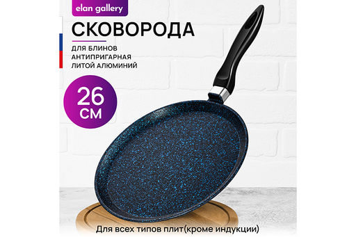 Сковорода блинная Elan Gallery "Сапфир" из серии "Гармония вкуса" диаметром 26 см равномерно разогревается и распределяет тепло таким образом, чтобы продукты сохраняли все свои полезные и вкусовые свойства. Сковорода изготовлена из литого алюминия и имеет ультрапрочное двухслойное антипригарное покрытие Cookmark. Оно защищает блинчики от пригорания и позволяет переворачивать их лопаткой без особого труда. Диаметр дна 24 см. Выполнена в стильном дизайне. Покрытие устойчиво к царапинам и износу, полностью безопасно для здоровья и не содержит PFOA или других вредных веществ. Готовьте блины идеальной формы на завтрак и радуйте ими своих близких! Эксплуатация: не нагревать без продуктов. Дайте посуде остыть, прежде чем помещать ее в воду. Использовать только деревянные и силиконовые приборы. Не мыть абразивными или щелочными моющими средствами. Использовать в посудомоечной машине только в режиме "Эко" с применением средств, не содержащих щелочи. Подходит для всех типов плит, кроме индукционных. Блинница станет идеальным подарком на любой праздник и придаст процессу приготовления пищи новый уровень комфорта. Подарите универсальную кухонную утварь своим близким. Хорошая блинная сковородка мечта любой хозяйки! В серии "Гармония вкуса" вы найдёте любые кухонные принадлежности и инвентарь для вашего дома. Соберите набор для вашей кухни в едином стиле!