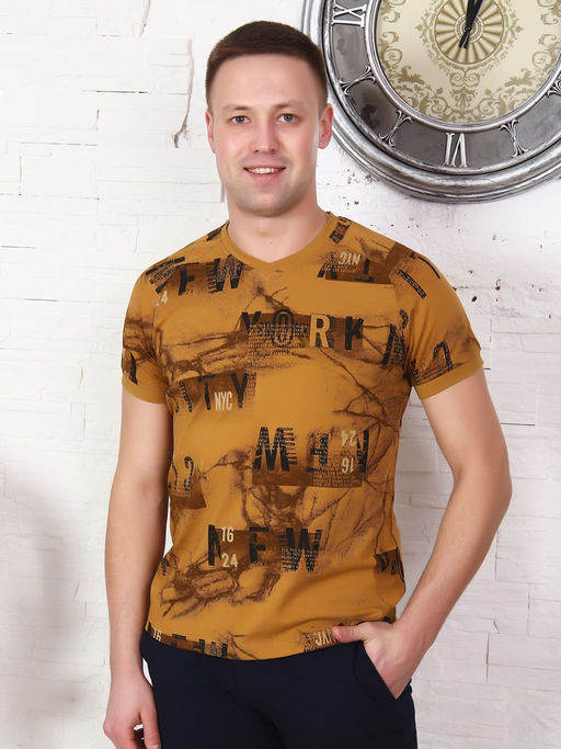 Стильная мужская футболка с V-образным двойным воротом. Рукав-реглан на манжете. Изделие выполнено из плотной высококачественной кулирки с лайкрой качества пенье. Модная, приятная к телу футболка с современным принтом идеально подойдет для повседневной носки или неформальных встреч.