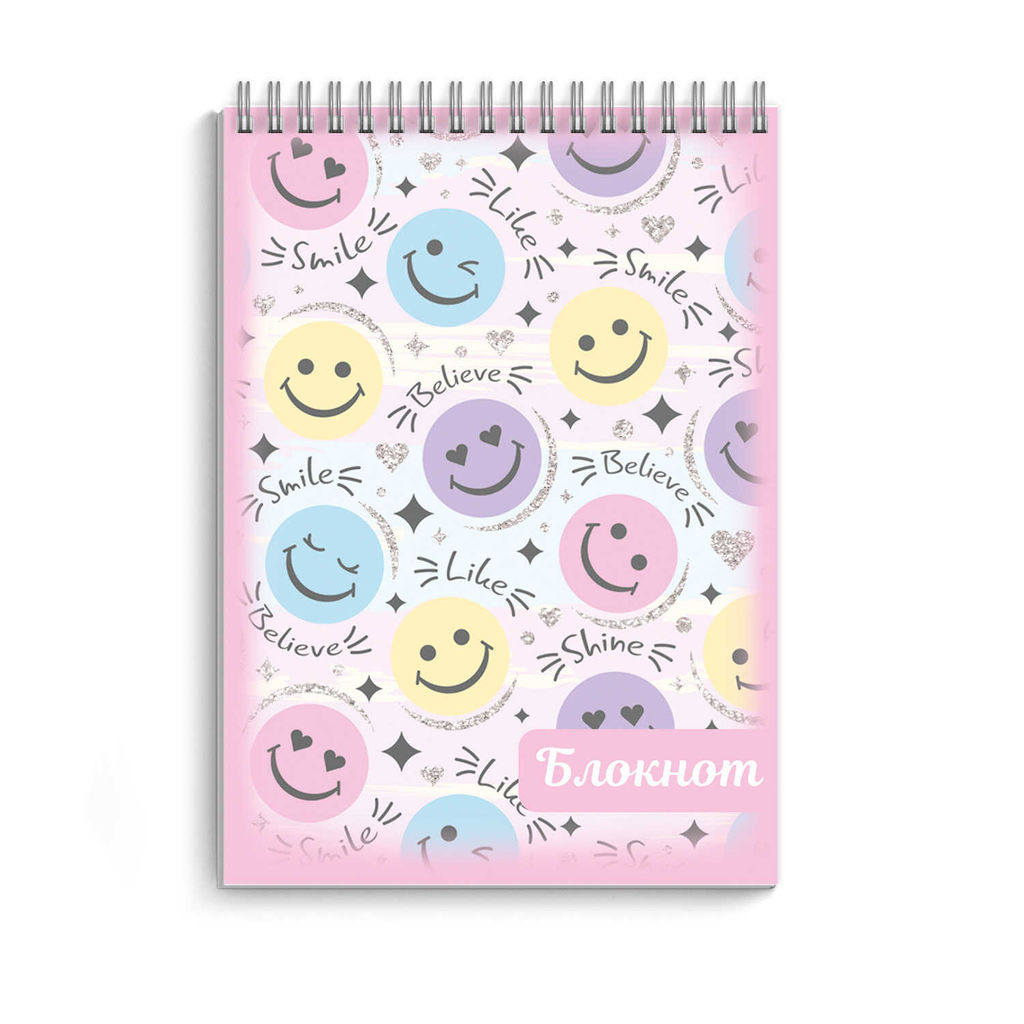 Блокнот, А7, 40 л, арт. 68164 СМАЙЛИКИ / Блок - белый офсет 60 г/м?, клетка, гребень по короткой стороне, УФ-лак выборочный с глиттером,