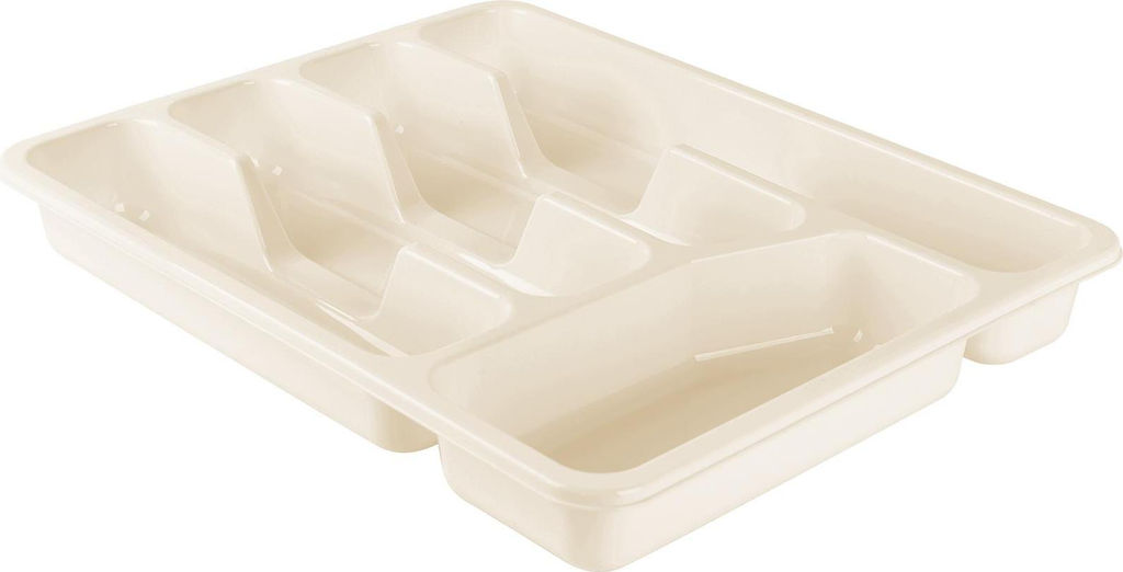 Лоток для столовых приборов позволит содержать ящики кухонного стола в полном порядке. Оптимально организуйте пространство с помощью пяти отсеков, разложив вилки, ложки, ножи и прочие столовые принадлежности по-отдельности. Большой отсек подойдет для хранения рулона с пакетами для завтраков. Легкий, прочный, пищевой пластик прослужит долгие годы и будет безопасен для здоровья. Материал не боится воды, лоток можно мыть в посудомоечной машине, поэтому уход за ним не составит труда.­