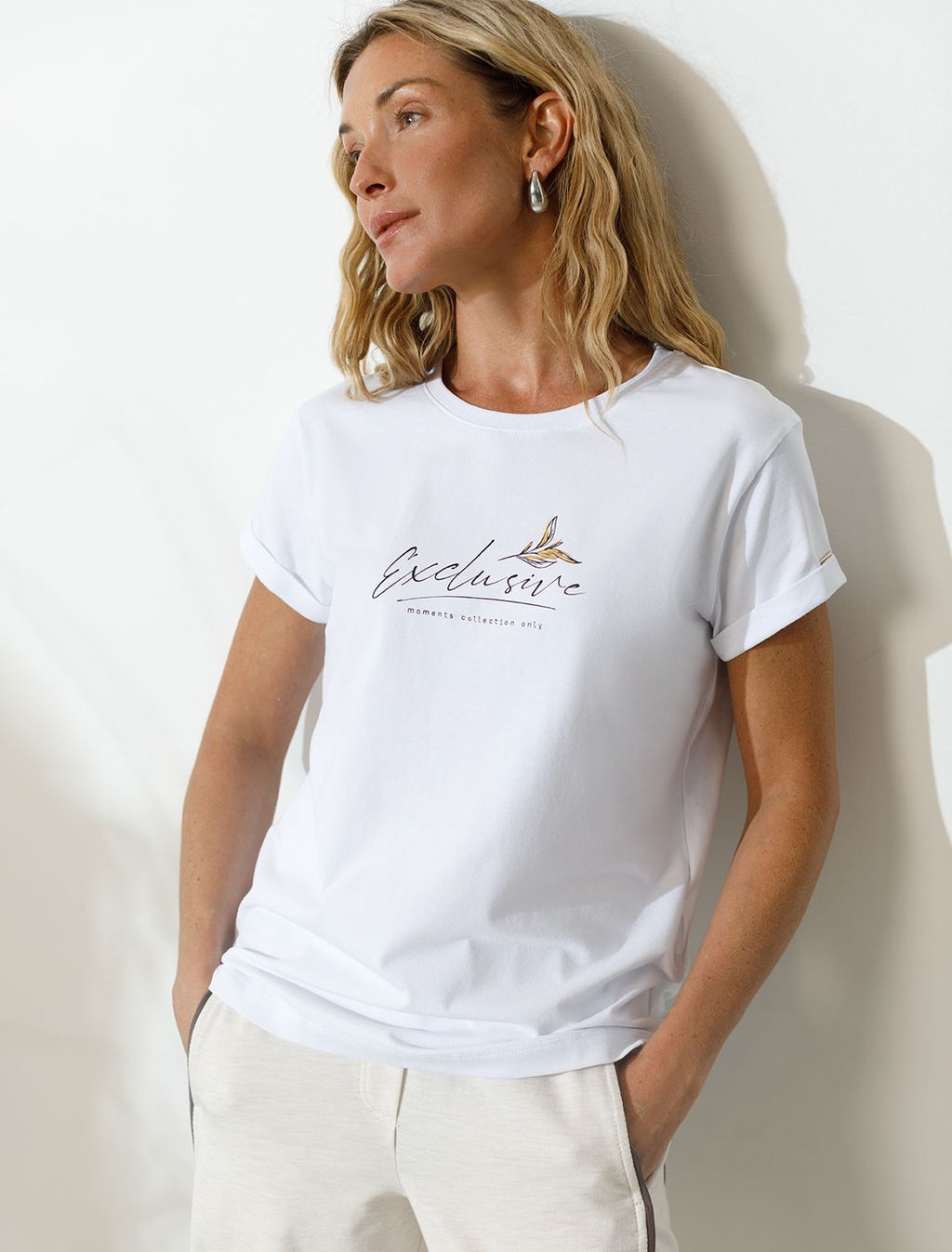 Модная футболка белого цвета привлекает внимание своим интересным дизайном и ярким принтом. Благодаря прямому крою изделие комфортно садится на любую фигуру, в том числе на большие размеры, и не сковывает движений. Круглый вырез подчеркивает современный стиль, а натуральный материал из хлопка с добавлением эластана обеспечивает удобство в повседневной носке и приятные тактильные ощущения. Прочность и износостойкая структура сохраняет первоначальную форму футболки после множества стирок. Рукава имеют аккуратные подгибы, что придает изделию завершенность и помогает сохранять аккуратный внешний вид. Принт в виде надписи нанесен красками с устойчивым покрытием, перевод надписи: Exluzive moments collection only - Только коллекция эксклюзивных моментов. Стильная футболка гармонично вписывается в любой гардероб и подойдет для прогулок, отдыха дома или неформальных встреч. Благодаря особенностям кроя модель хорошо сидит, скрывая недостатки и подчеркивая достоинства. Удобная футболка идеально сочетается с базовыми вещами, позволяя создавать новые интересные образы каждый день.­