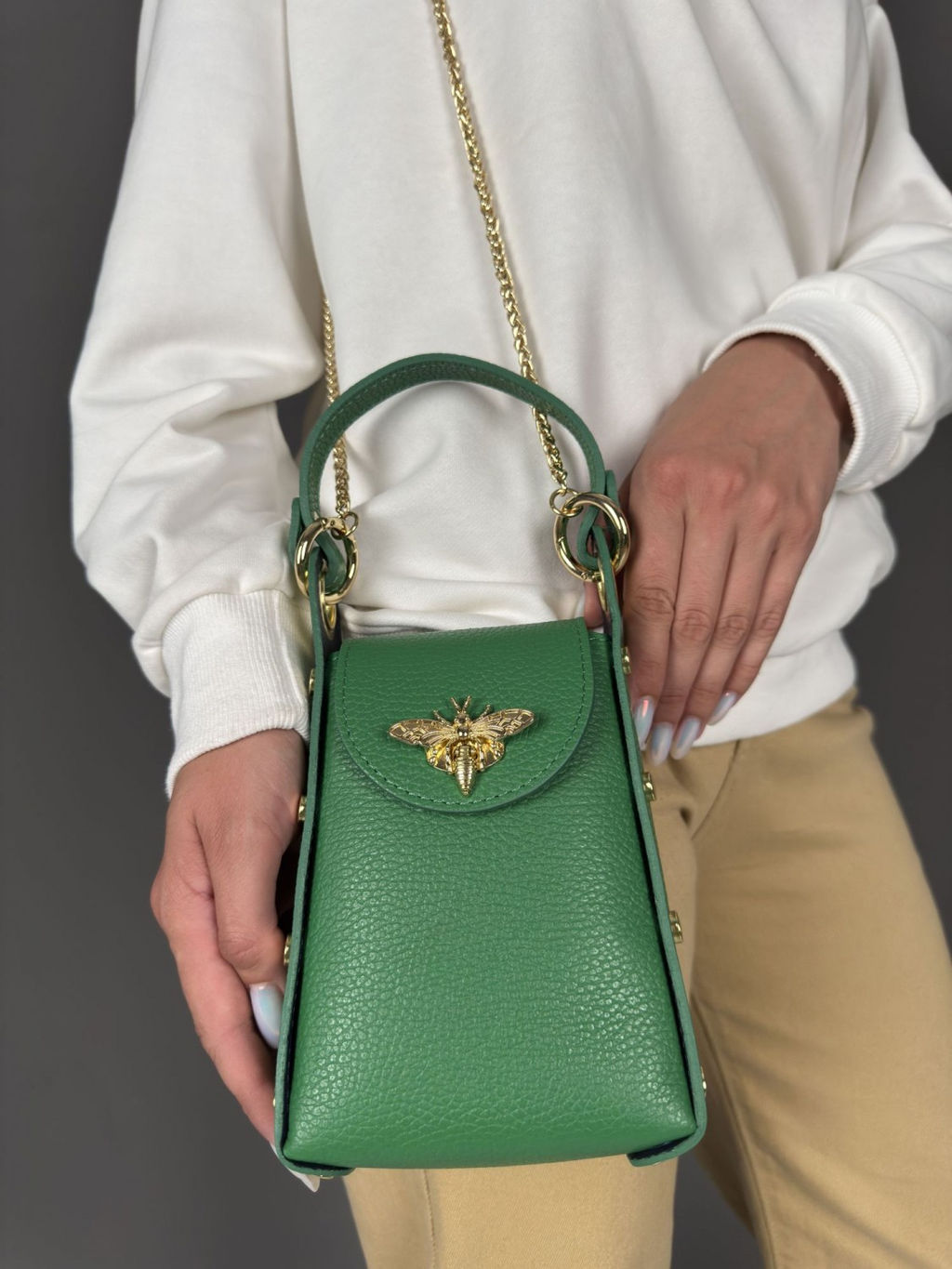 Страна: Италия Акции: Товары со скидкой Производитель: Pelletteria Luisa, Italy Размер: маленькая Стиль ношения: на ремешке через плечо Форма: жесткая Выделка кожи: зернистая износостойкая Цвет кожи: Зеленый Оттенок: ярко-зеленый Упаковка: Пакет тканевый L, 40x40 см Палитра цветов: TB-105944 Dollaro Размеры: длина: 13 см \tвысота: 21 см \tширина: 6 см Описание: Красивая аккуратная необыкновенно модная женская сумка кросс-боди из натуральной кожи. Базовая коллекция Sefaro, Италия. Особенности сумки: замок в виде золотой бабочки, плечевой ремень-цепочка, а также заклепки на боковых стенках сумки - фурнитура высокого итальянского качества. Все эти элементы непременно привлекут к вам внимание окружающих своей яркостью и оригинальностью исполнения. Сумочка имеет каркасную форму, компактная, выполнена из зернистой телячьей кожи, может использоваться как повседневная модель, но подойдет и для торжественного случая - элегантно дополнит вечерний образ по типу клатча, либо подчеркнет сдержанный лук. Закрывается сумка на крышку с застежкой, внутри один отдел, в котором поместится всё самое необходимое. На дне сумки металлические защитные ножки. Можно носить в руке, либо на изящной цепочке через плечо (длина 110см) - очень удобно!