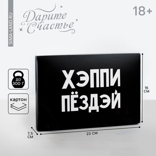 Форма: Прямоугольная. Плотность, г/м²: 250. Длина, см: 23. Ширина, см: 16. С ручками: Нет. Высота, см: 7.5. Допустимый вес вложения, г: 300. Тематика: Приколы. Символ года: Нет. Тематика праздника: День рождения. Тематика праздника: Универсальная тематика. Вид: Коробки. Вид: Складные коробки. Размер: Средний (18-24 см). Форма: Прямоугольная. Бесплатная доставка: Да. Наша разработка: Да.