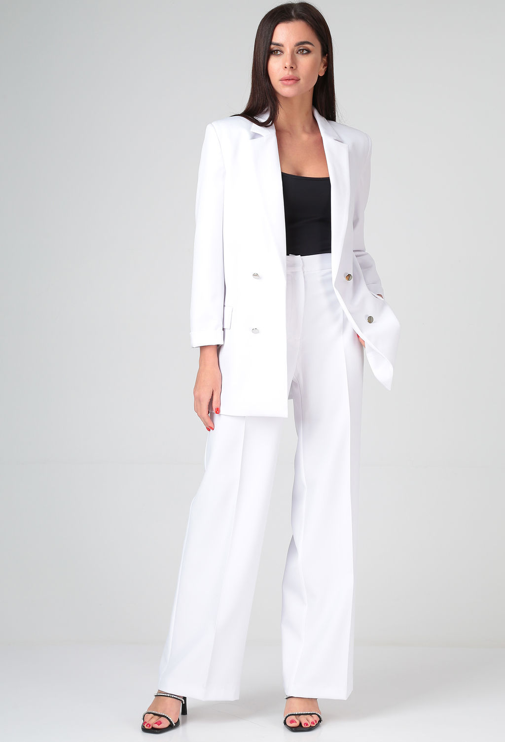 Брюки прямые от бедра с высокой посадкой и широкие к низу. Покрой прямой. Верх брюк обработан отрезной обтачкой,