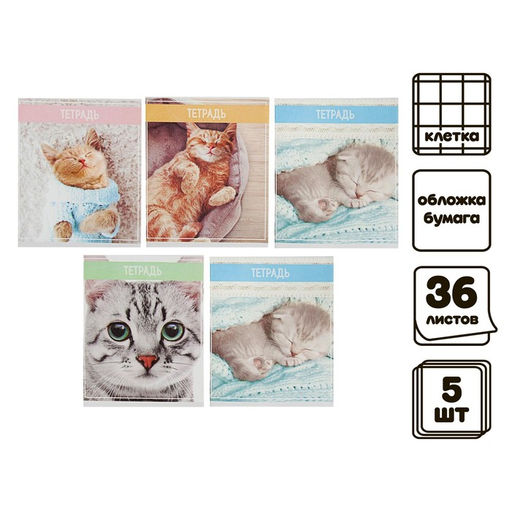 • Комплект тетрадей из 5 штук (4 разные + 1 повторяющаяся), 36 листов в клетку Calligrata "Кошки", обложка мелованная бумага, блок №2, белизна 75% (серые листы)