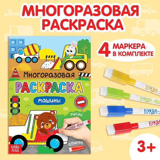 • Раскраска детская Рисуй-стирай. Машины, 12 стр., многоразовая, с маркерами, 3+