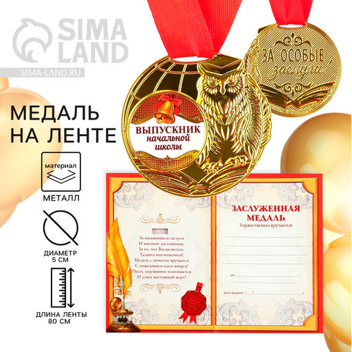 Медаль школьная на Выпускной «Выпускник начальной школы», на ленте, золото, металл, d = 5 смВыпускной – это важное событие для ребенка. Медаль на ленте является прекрасной наградой и запоминающимся подарком, который подчеркнет значимость мероприятия.- диаметр медали 5 см.;- диаметр вкладыша 2,4 см.;- длина ленты (в сложенном виде) 40 см. Для кого: Для мальчика. Для кого: Для девочки. Диаметр медали, см: 5. Длина ленты, см: 40. Вид упаковки: Подложка. Вид упаковки: PVC-пакет. Тематика праздника: Выпускной в школе. Адресат: Выпускнику начальной школы. Наличие символики РФ: Нет. Наличие ленты: Да. Бесплатная доставка: Да. Наша разработка: Да. Размеры товара: 0.3/5/5.