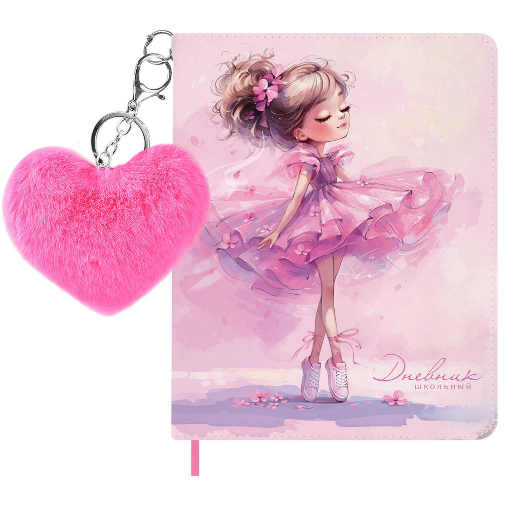 Дневник школьный в комплекте с брелоком, формат А5+, 48 листов арт. 72423 / 15 БАЛЕРИНА В КЕДАХ (кожзам: А5+; твёрдый переплёт с поролоном, материал обложки: искусственная кожа "Наппа"; декор: печать полноцветная; способ крепления блока: ниткошвейный; вн. блок: 48 л., белый офсет 80 г/м?, печать в одну краску, справочный материал: универсальная шпаргалка; закладка: одно ляссе; форзац: печать в одну краску; особенности: брелок из искусственного меха в комплекте; индивидуальная упаковка: ПЭТ-пакет)