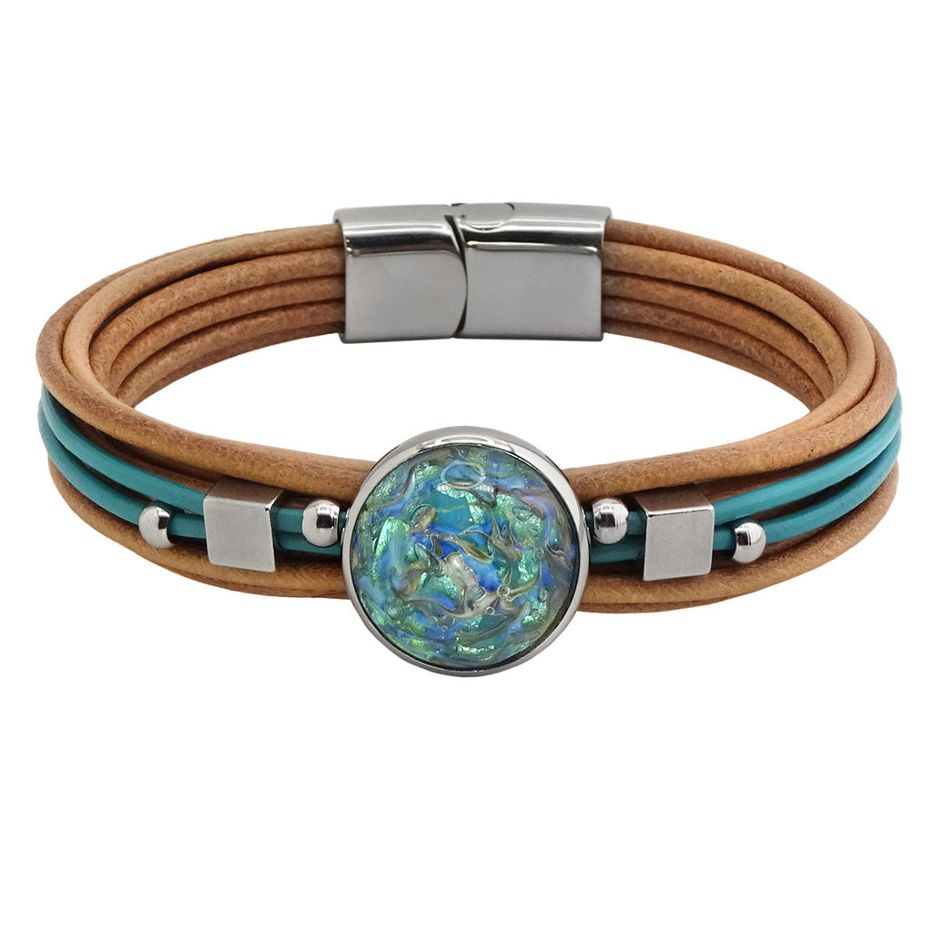 Браслет изготовлен из муранского стекла, натуральной кожи и гипоаллергенной ювелирной стали, что очень важно для людей с чувствительной кожей. Металл не темнеет и не подвергается воздействиям окружающей среды, надолго обеспечивая красивый внешний вид изделия. Крепкий магнитный замок с двойной защитой надежно фиксируется на запястье. Ширина браслета - 1,5 см. Диаметр стеклянного элемента - 2 см. Вес - 24 гр.