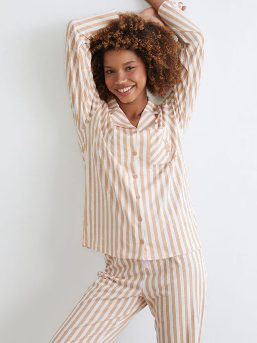 G?mlek Yaka ?izgili Kad?n Pijama Tak?m?