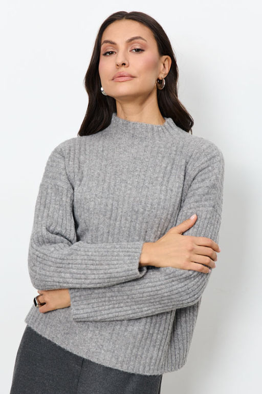 Этот джемпер воплощение комфорта и стиля. Его свободный силуэт и мягкая фактура в рубчик создают расслабленный, но элегантный образ. Длинные рукава со спущенной проймой добавляют непринужденности, а цельнокроеный воротник-стойка придает завершенность. Изделие выполнено из меланжевой пряжи.
