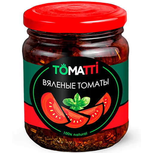 Вяленые томаты TOMATTI – закуска приготовленная из свежих томатов по итальянскому рецепту. Нежные сладкие дольки томатов, подвяленные на солнце, аккуратно уложенные в баночку с натуральным маслом, пропитанным ароматным базиликом – вкусное мгновение итальянского лета в любое время года на вашем столе. Простой перекус может создать Вам праздник: для брускетт, канапе, к мясу, к вину или запечённым овощам. Вяленые томаты TOMATTI - доступный деликатес, который любое блюдо сделает праздничным. Состав: Томаты вяленые, масло подсолнечное рафинированное, базилик, орегано, сахар, соль.