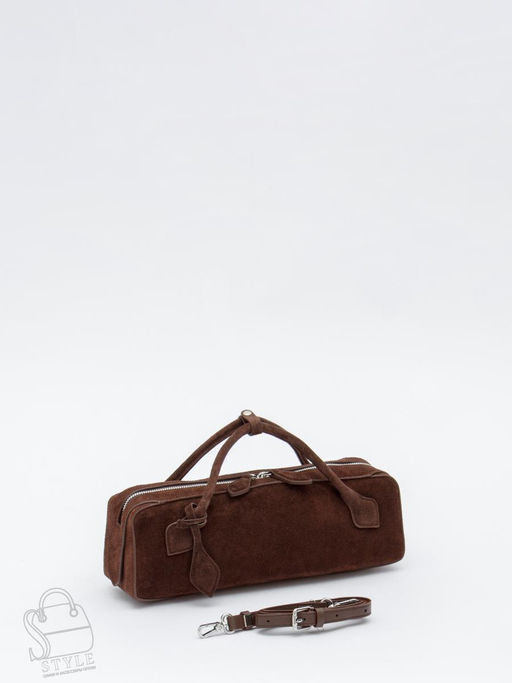 Модель-багет, выполнена из замши. Декорирована брелоком. Дополнена серебристой фурнитурой. Данная модель закрывается на молнию, носится в руке за встроенные ручки или на плече с помощью ремня. В комплекте предусмотрен ремень с регулировкой длины. Каркас полужесткий.