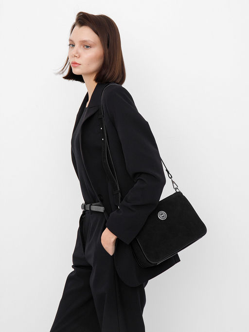 Удобная модель, выполнена из замши. Декорирована логотипом на передней части. Дополнена серебристой фурнитурой. Данная модель закрывается на молнию. Каркас полужесткий. Носится на плече. В комплекте имеется съемный ремень с регулировкой длины.